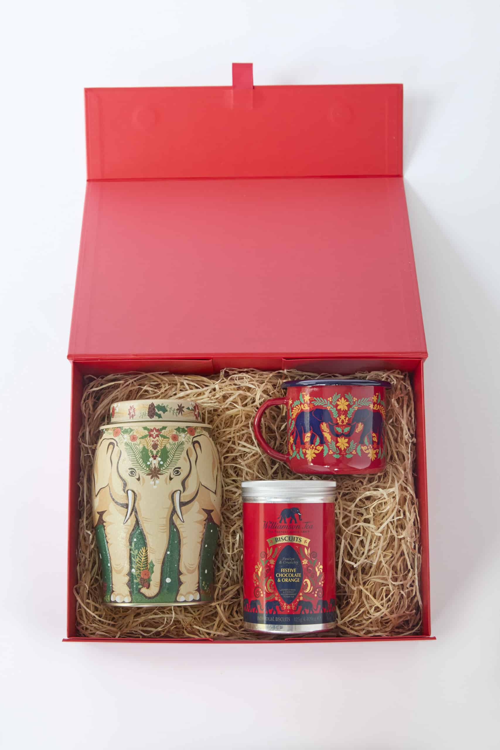 A Christmas Gift for someone special. Our Perfect Christmas Gift Set contains our limited Edition Winter Garland Elephant Gift Caddy, our new Festive Chocolate and Orange Biscuits and a sturdy Festive Enamel mug. Let someone special enjoy a delicious mug of steaming tea with an indulgent Chocolate and Orange biscuit this Christmas.